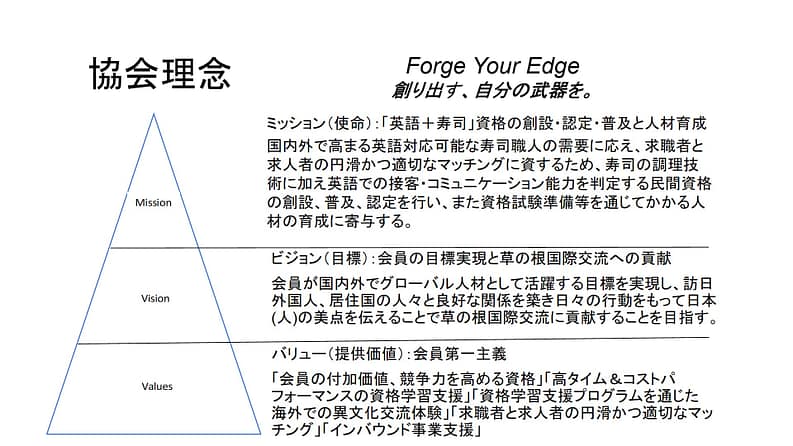 ミッション(使命):「英語+寿司」資格の創設・認定・普及と人材育成