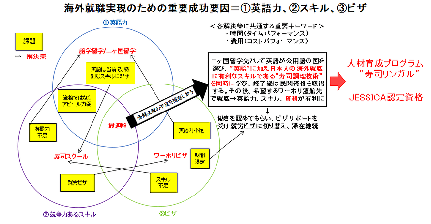 既存寿司スクール(寿司アカデミー、寿司学校とも呼ばれています)の宣伝を見ると「海外で寿司職人になれば年収X千万」のような言葉が並んでいます。そして、そのような切り口で取り上げるメディアもあります。しかしながら、本気で海外就職を目指すなら寿司だけでは十分とは言えず、①語学力(英語力)、②スキル(手に職)、③就労ビザのすべてをクリアしなければならないというのが、当協会で行った重要成功要因(KSF)分析です。③のビザは誰かがお膳立て出来るものでもないので道筋だけ示し、②だけでなく①(既存スクールではこの部分は自分で行うこととしてタッチしていません)も含めてこそ道が拓けるのではないかと考えました。